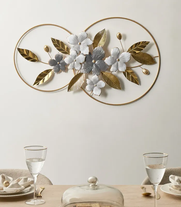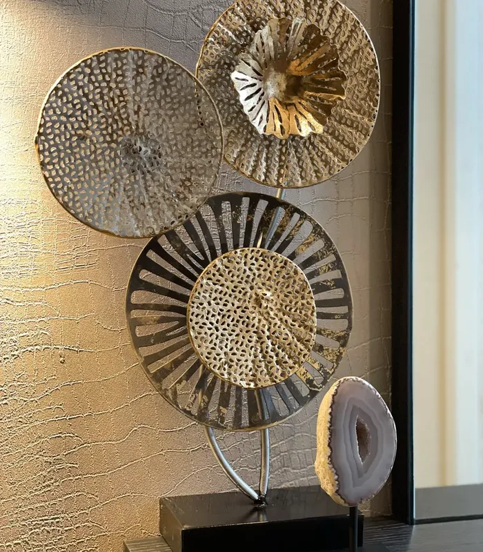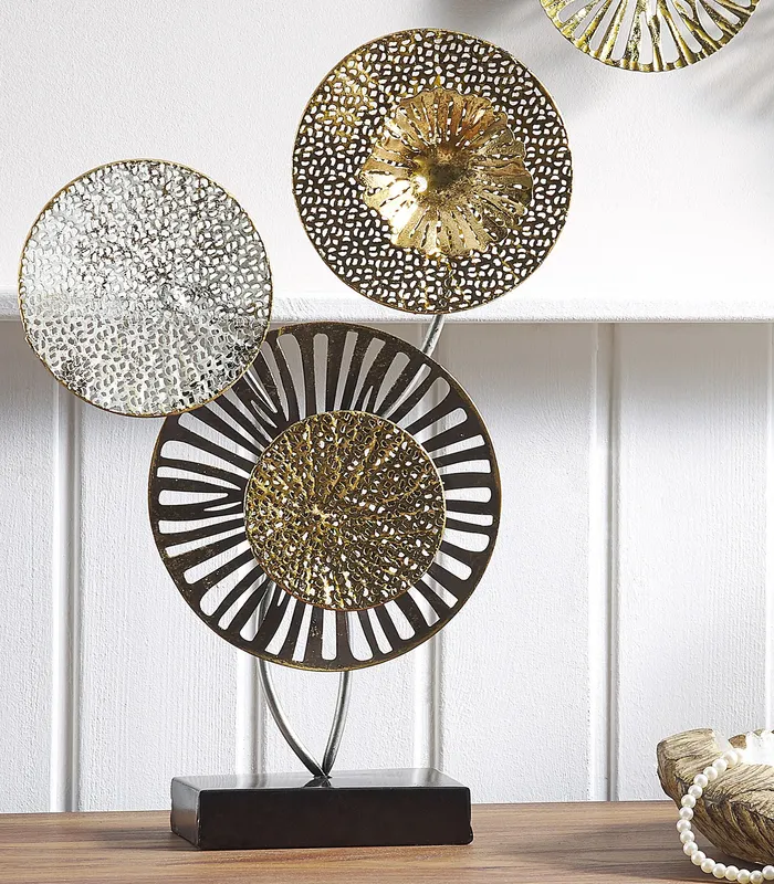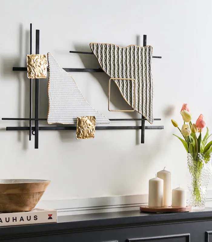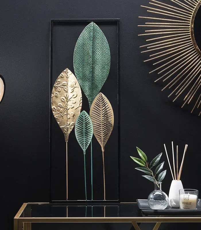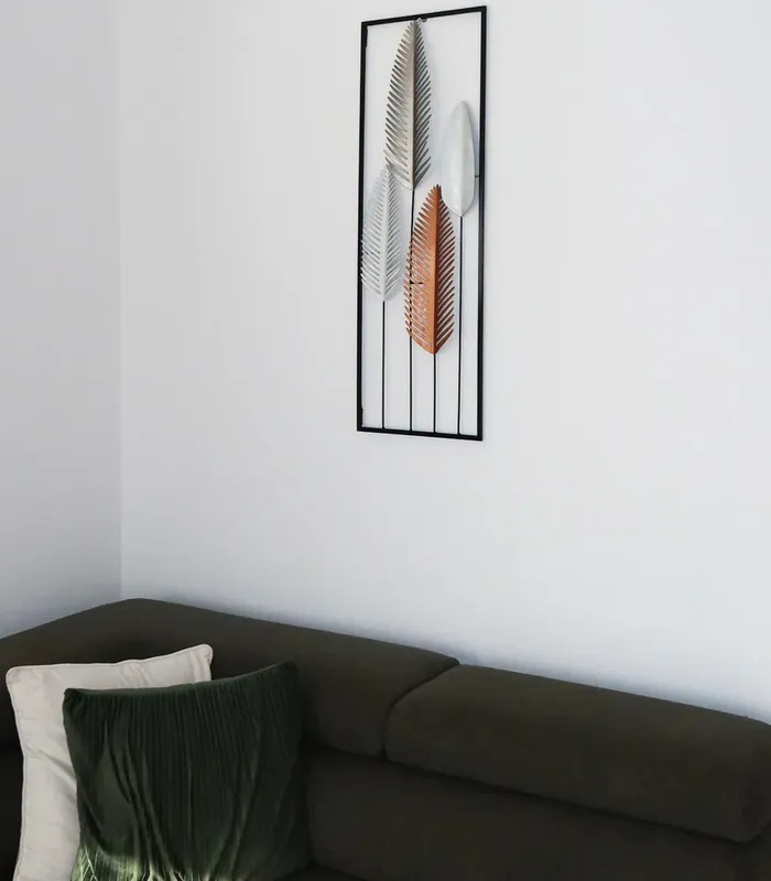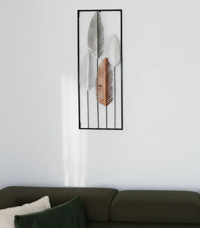 Metal wall art with a nature-inspired feather pattern in black, silver, and gold tones. A refined decorative accent for modern and industrial interiors.