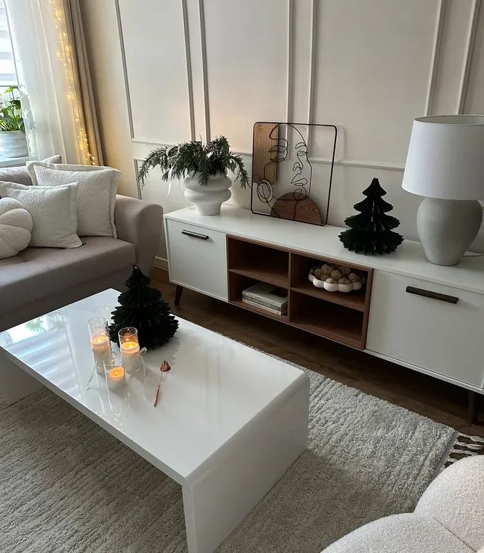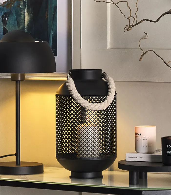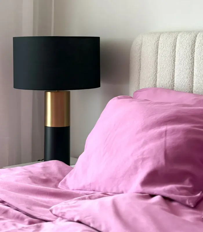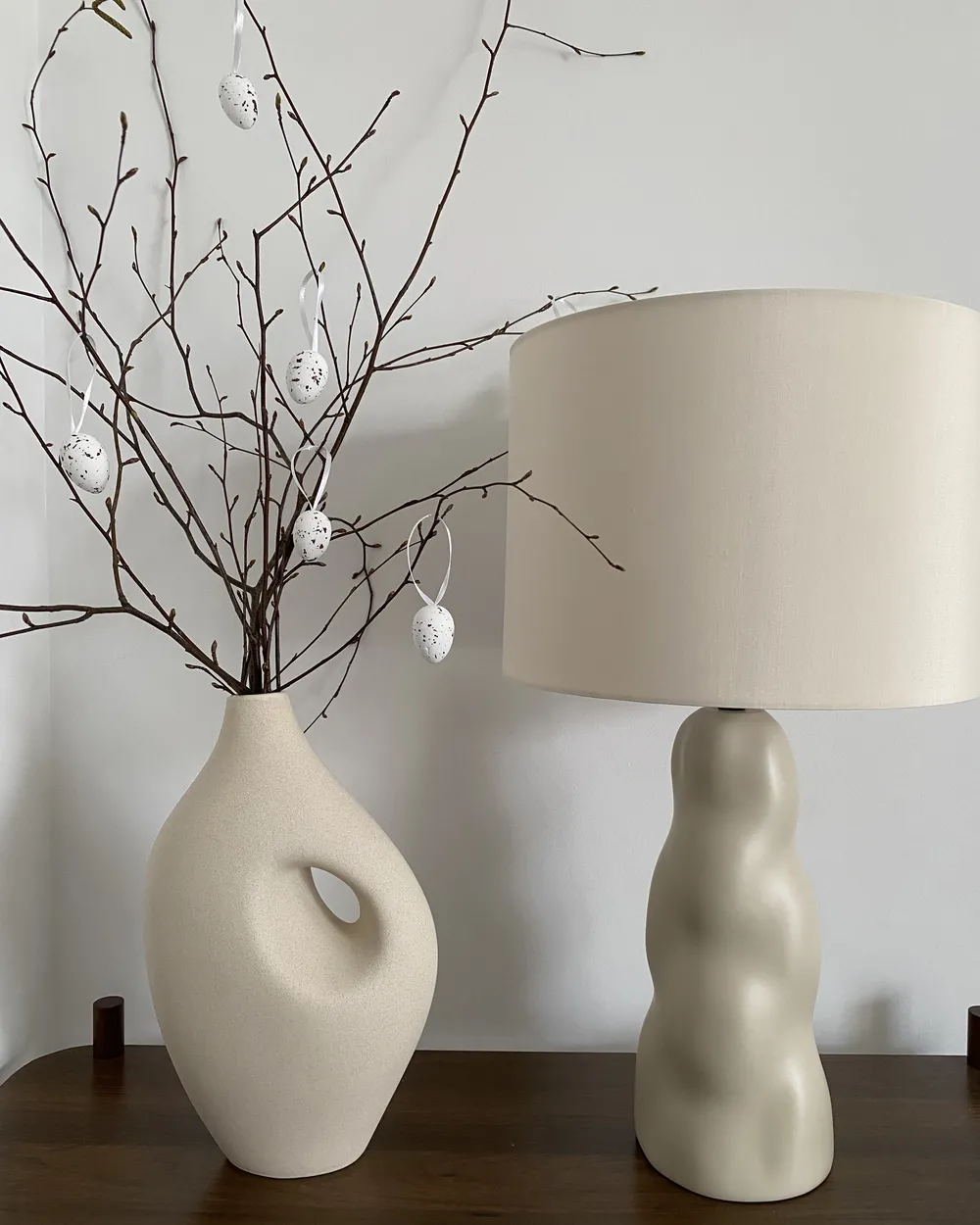 Minimalist table lamp with a decorative ceramic base and a beige linen drum shade. A refined lighting accent for bedrooms and living rooms.